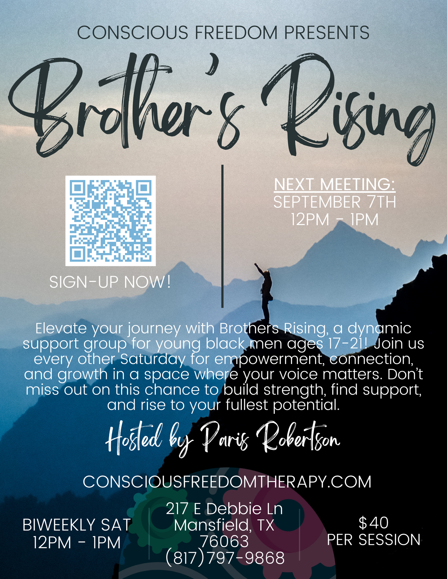 For more details or if you have any additional questions, please contact us at (817) 797-9868 or cfadmin@consciousfreedomtherapy.com. You can also visit our website at Consciousfreedomtherapy.com. We’re here to help and look forward to welcoming you to Brothers Rising!