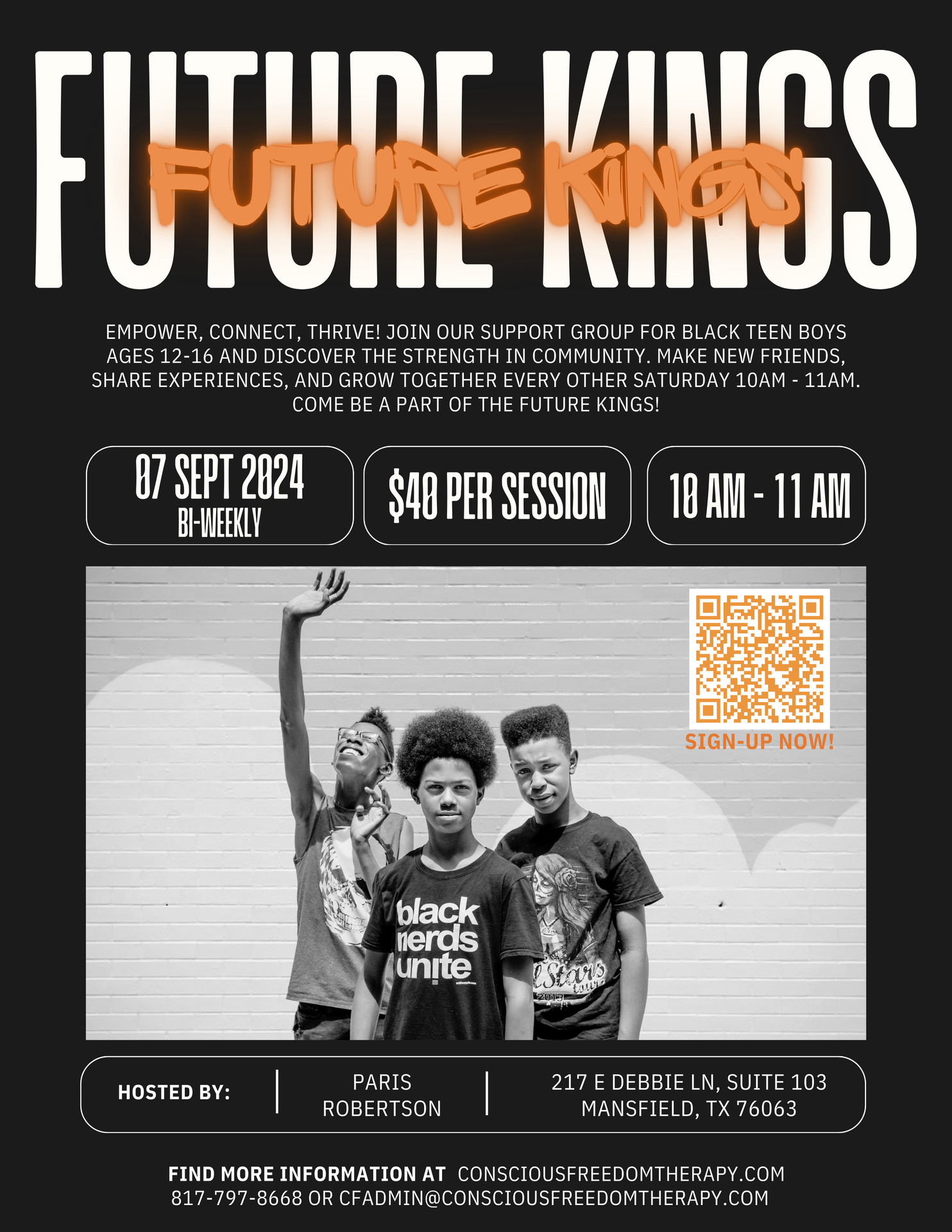 At "Future Kings," we believe in the power of unity and the strength that comes from standing together. Our group activities range from discussions and workshops to team-building exercises, all aimed at reinforcing a positive identity and fostering resilience. We understand the unique pressures that black teens encounter, and we are committed to helping them develop the tools they need to succeed. Join us every other Saturday at 10 AM at Conscious Freedom, located at 217 E Debbie Ln., Mansfield, TX 76063, and be a part of a movement that is shaping the future, one young king at a time.